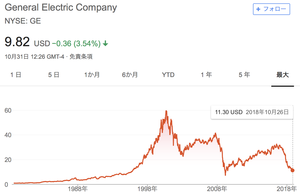 GEの株価は1年半前から-66%と大暴落を記録しています。