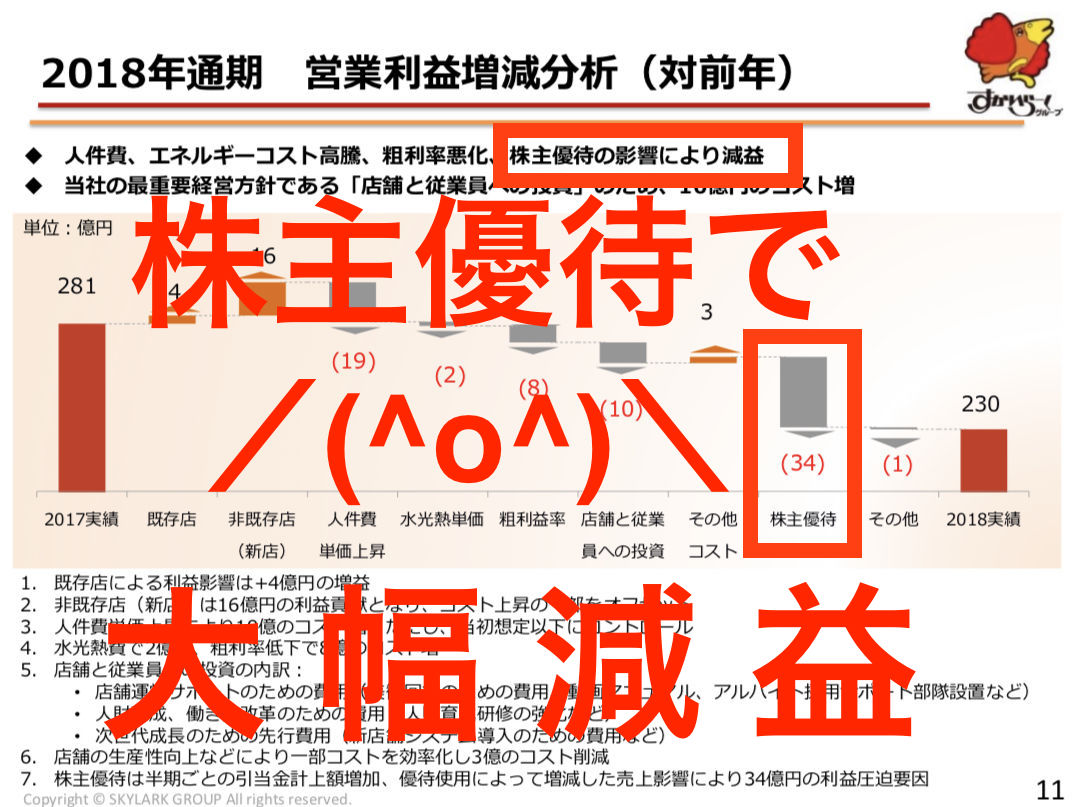 しかし、毎回決算資料に「株主優待が原因で減益になる」と言い訳する企業はすかいらーくのみであり、いわば会社の運営を担っている株主自身が利益を貪る害となっている。