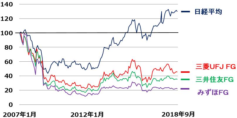 この理由は、好景気になっても異例のマイナス金利政策の出口が見えず、収益環境の悪化が拡大する一方であるためです。