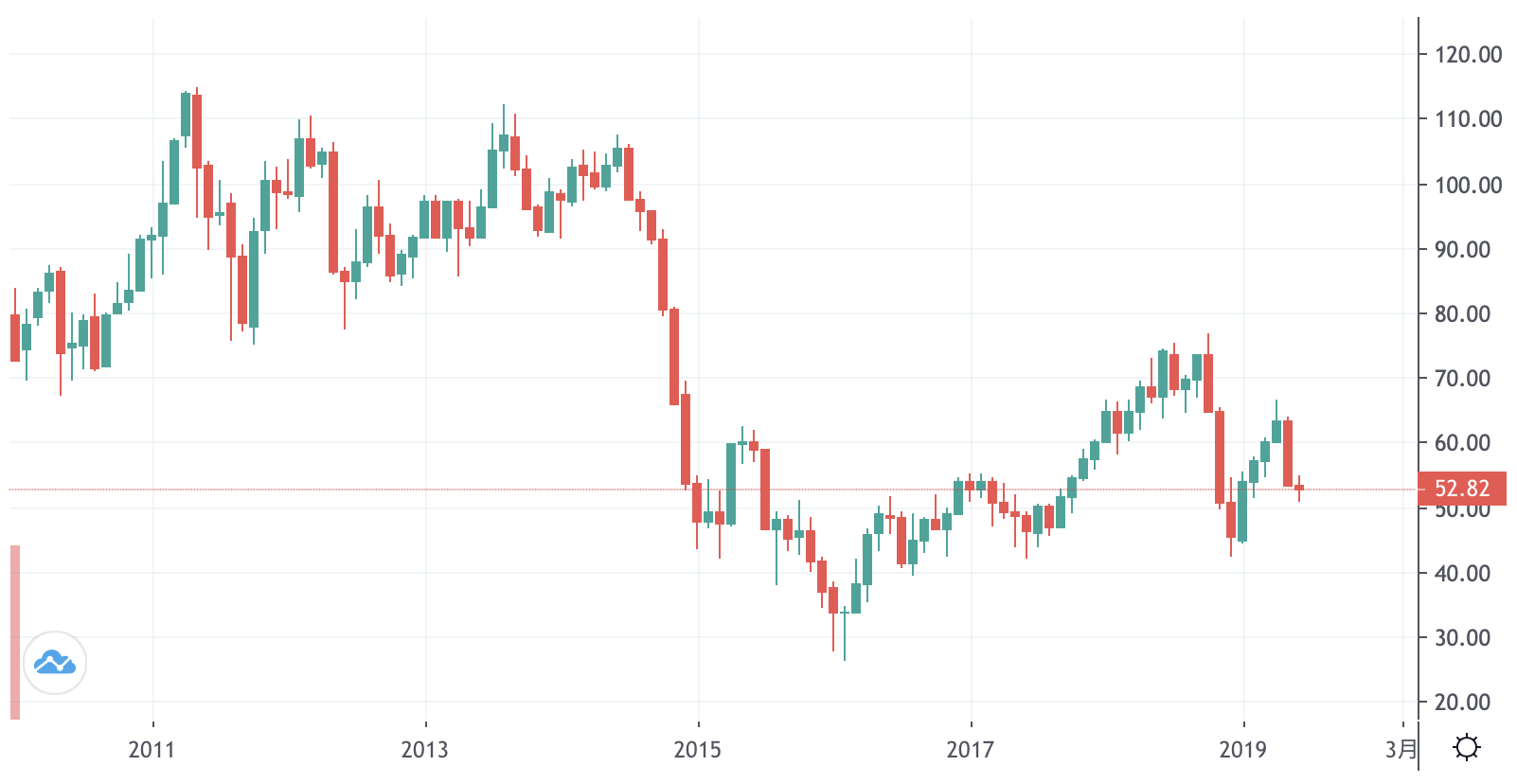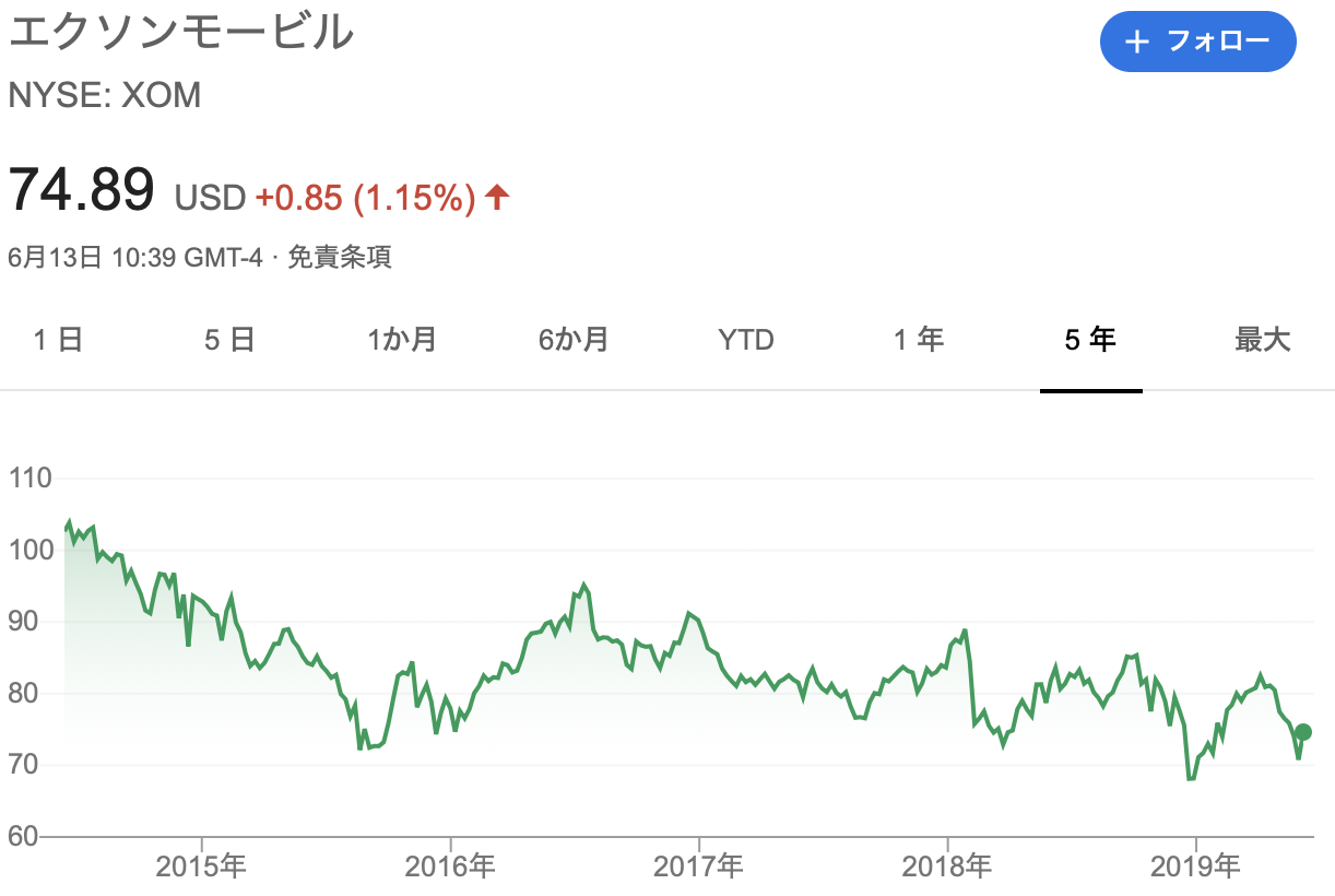 エクソン・モービルの株価チャートを見ると5年前から低迷が始まったのが分かりますが、基本的にオイルメジャーは原油価格と相関があるため、原油が上がらないことには株価上昇は見込めません。