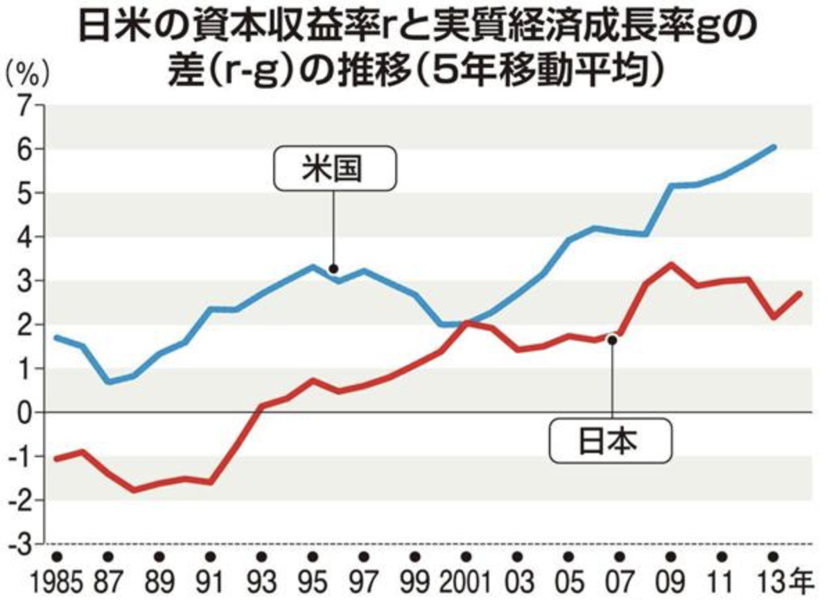 資本収益率は r (株式などの投資リターン)、経済成長率は g (労働収入)を指します。