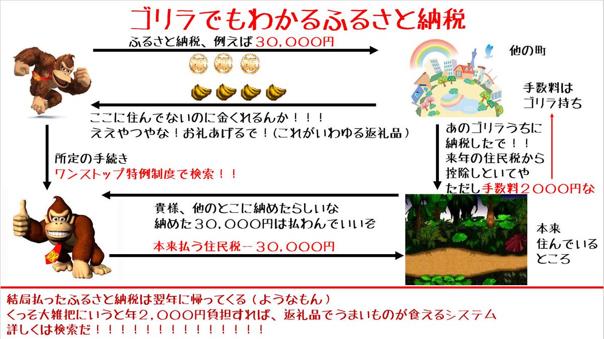 — がーすー (@ga_su_0416) 2019年7月2日・ゴリラ「ふるさと納税を3万円するで」・他の街「住んでないのに金くれてサンキュー!返礼品あげるで」・住んでる街「他の街に納めたのか!うちに本来払うはずの3万円払わなくてよいぞ」・ゴリラ「やったぜ!ワンストップ制度で確定申告も不要やで」結局払ったふるさと納税は翌年に帰ってくる。くっそ大雑把に言えば年2,000円負担すれば、返礼品でうまいものが食えるシステム。こんなにリツイートして下さってありがとうございます。
