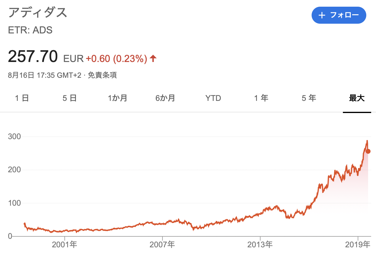 たとえば、アディダスの昨年度の決算は過去最高益の絶好調ぶりで、純利益が前年比54.9%増の17億400万ユーロでした。