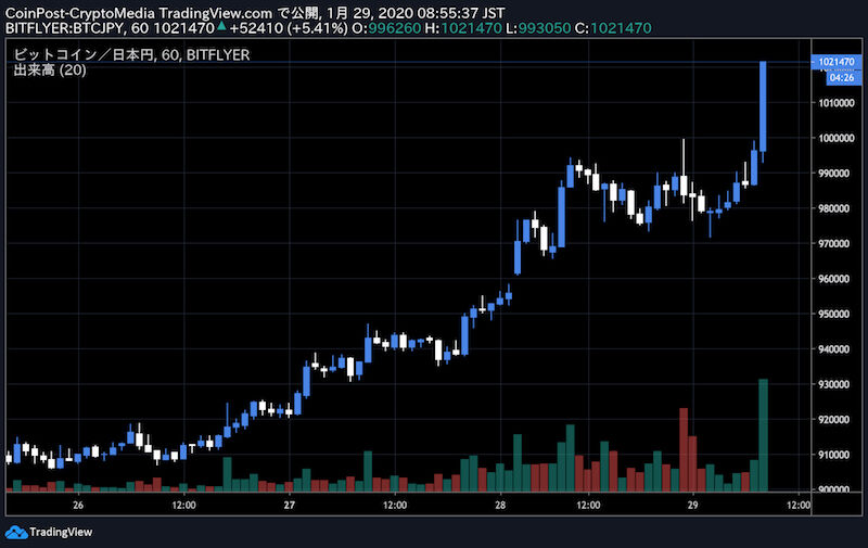 コロナウイルスの影響を受けて世界株式が急落する中、ビットコインのみが急騰し、100万円/1BTCを超える値を付けています。