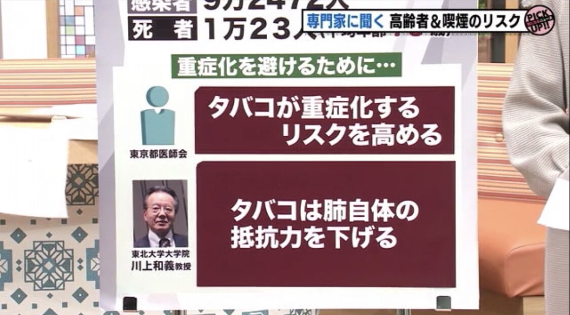 つまり、タバコを日常的に吸い続けている人は既に肺がボロボロなので、コロナの症状に細胞組織が耐えきれなくなり、命を落とす危険性が高まる。