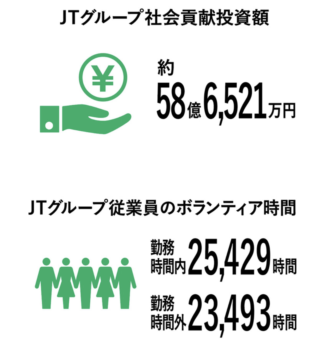 たとえば、JTでは年度毎の社会貢献をまとめたサイトを用意しており、2018年は社会貢献投資額が58億円、従業員のボランティア時間が勤務内25000時間、勤務外23000時間とアピールに余念が無い。