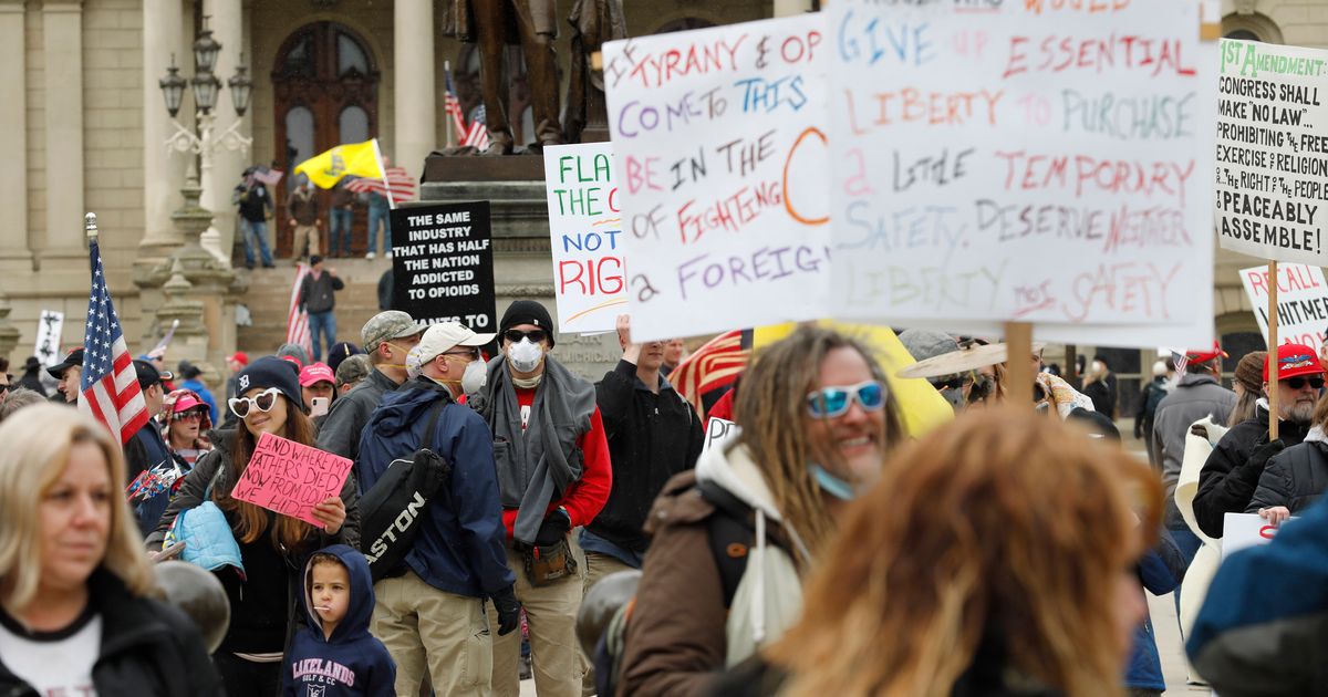 デモ参加者は星条旗を振り回し、ロックダウン反対を大声で叫ぶもので、参加者はマスクもせずに密集しました。