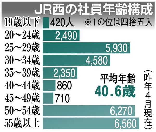 当時の氷河期の新卒たちは現在40代ですが、JR西日本の年齢別社員構成を眺めるとこの年代だけポッカリ穴が空いてしまっている。
