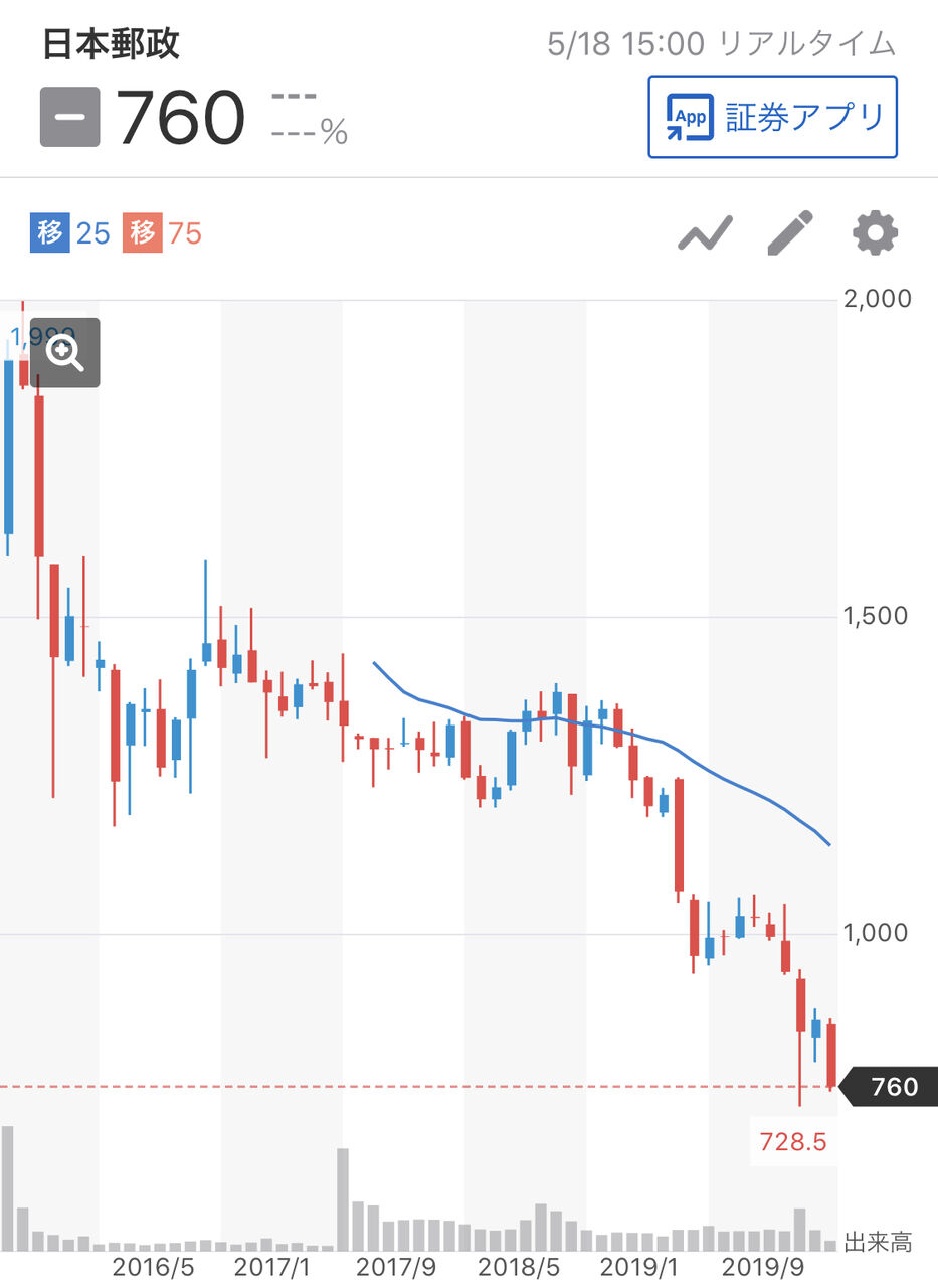 しかし、日本では国民が減り続ける中、郵便、保険、銀行という斜陽産業に期待する者などおらず、株式売出し受渡初日から全員含み損という仕打を受けている最悪最低な株になった。