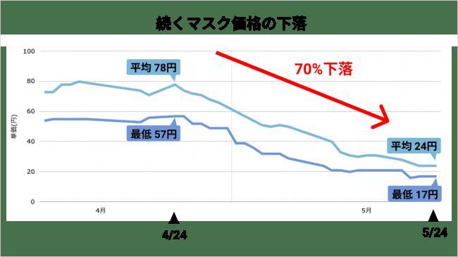 その後、感染者数が徐々に落ち着いて来たことも材料となり、マスク需要は激減、市場にはマスクが大量に溢れるようになり激しい値崩れが起こりました。