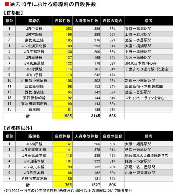 特に高崎線、東海道線、東武東上線、中央線などの首都圏は人身事故の件数が多く、2日に1件の割合で事故が発生する計算になります。