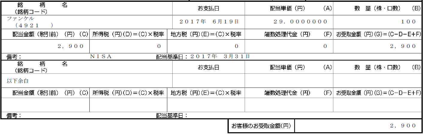 [4921]ファンケルより2016年期末配当金をいただきました。100株保有であったため2,900円となっています。NISA制度利用のため非課税です。