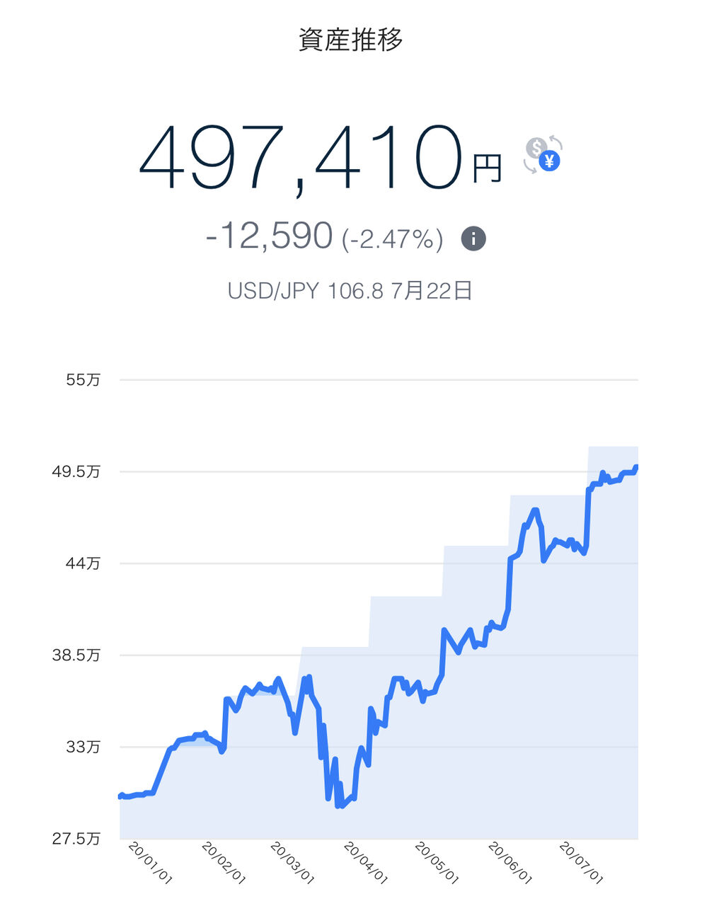 | 2020年7月4週目 | 497,410円 | -12,590円 | -2.47% |