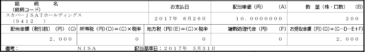 [9412]スカパーJSATホールディングスより2016年期末配当金をいただきました。200株保有であったため2,000円となっています。NISA制度利用のため非課税です。