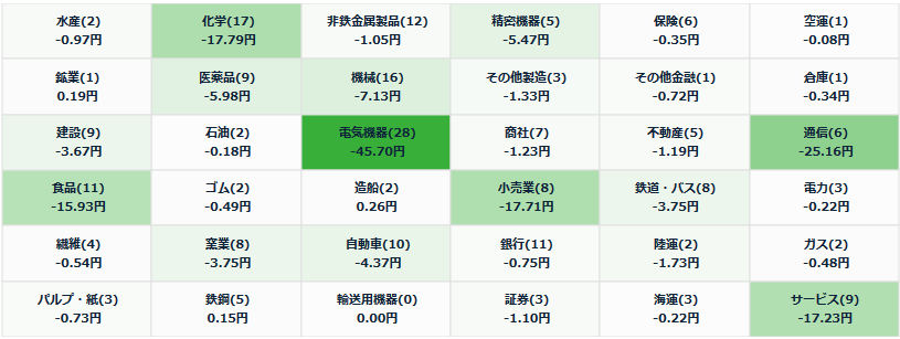 ご覧の通り、斜陽産業である電気機器セクターの割合が大きすぎているのがわかります。電気機器メーカーを非難するわけではありませんが、電気機器セクターがかつての花形であった昭和の時代から比べると、人件費高騰や通貨価値上昇による円高により安売り合戦の海外製に勝てず、結果的に内需にしか強くない産業になってしまっています。