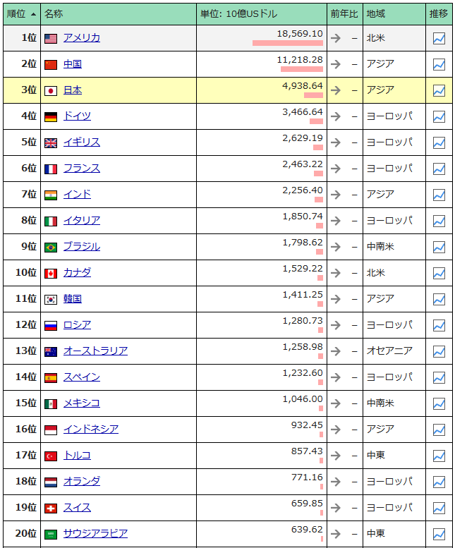 さて、日経平均のパフォーマンスが悪いとはよく言われています。覇権国家米国のS&P500と比べるのはさすがに分が悪いですが、世界GDP第3位である国家であることを鑑みると、直感的な感覚では日経平均はもう少し上昇してもいいのではないかと考えてしまうかと思います。最新の世界GDPランキングを見てみます。