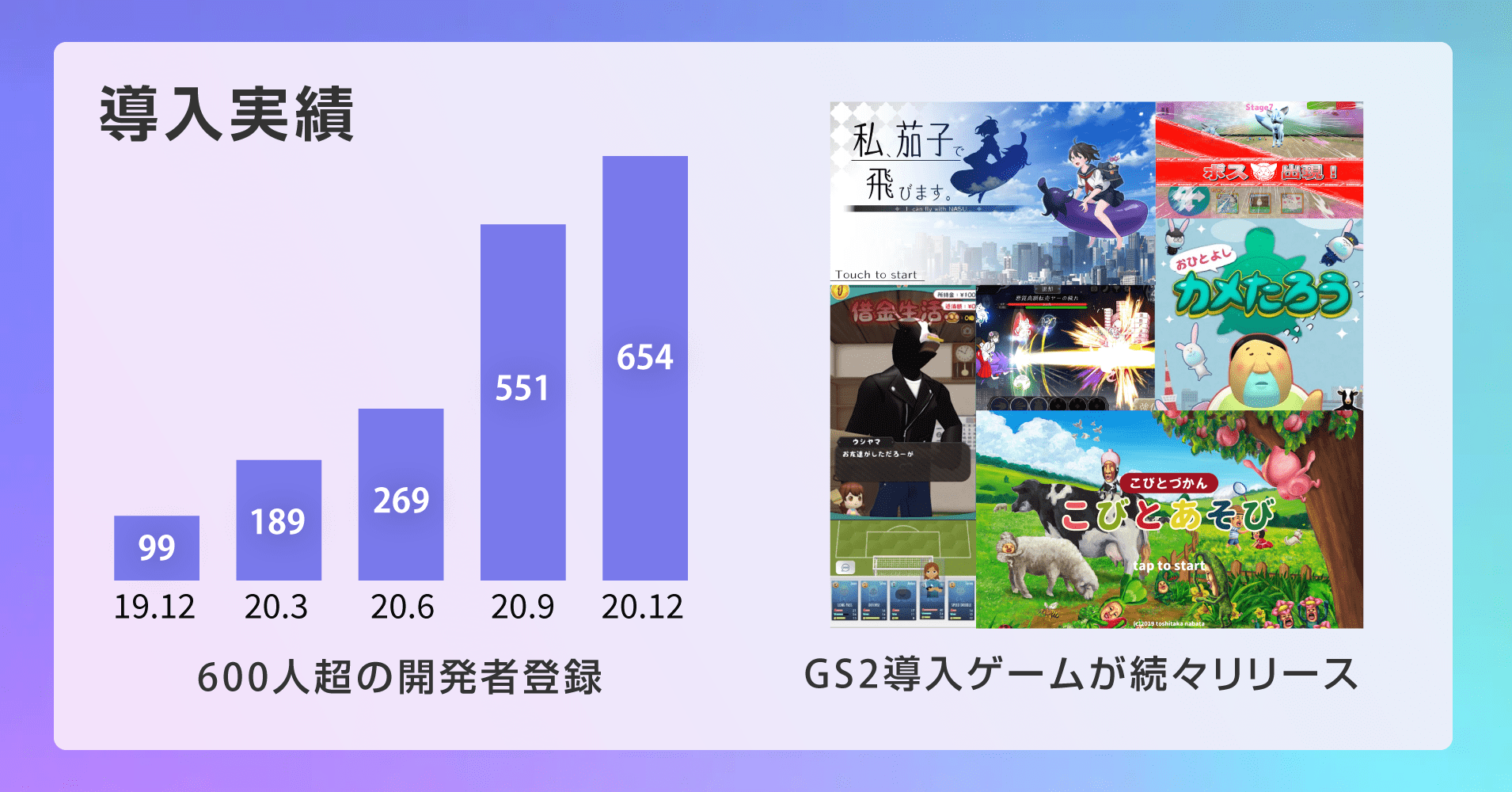2020年12月末時点で既に累計で654名の開発者が登録しており、個人開発者や中小デベロッパーを中心に導入事例が出始めています。