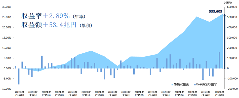 年金積立金管理運用独立行政法人(GPIF)が2016年度の運用実績を発表しました。結果はなんと7兆9363億円の黒字!総資産額は過去最高の145兆円を上回る勢いです。世界的な株高の影響はもちろん大きいですが、年々増加する配当金が資産増加ペースを押し上げているのは間違いありません。