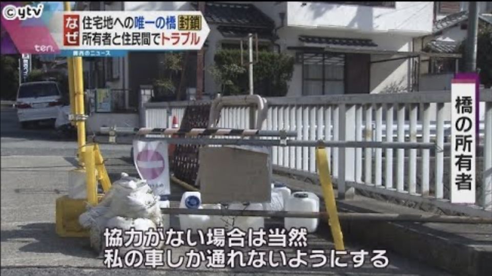 所有者は老朽化のため「維持管理費がかかる」として住民に購入を求め、住民は市への移管を提案するが、主張は平行線をたどっている。2019年12月末の午前10時ごろ、神戸市北区山田町小部。有馬街道(国道428号)に沿う天王谷川にかかる1本の橋の上に突然、鉄パイプや土のう、ドラム缶が置かれた。進入禁止の標識の紙が添えられ、張り紙には所有者の名で「維持管理費等のご協力を得られない為、住民の皆さまの安全を確保する」と書かれていた。橋の東側の住宅地の住民にとって、他に車で地域外に出る道はない。住民らは警察に通報し、所有者に申し入れた末、約1時間後に封鎖が解かれた。以降も、20年9月までに計8回、封鎖と解除が繰り返された。橋が個人所有だと住民が知ったのは19年4月。橋に付属する上水道管に亀裂が入り、補修費について市水道局と調整していた際、市有でないと判明した。修理の許可を得るため所有者を探していたところ、元々の所有者から17年に有償で譲り受けたという現在の所有者が名乗り出た。橋は住宅街が開発された時期と同じ1970年代後半にできた。関係者によると、入居当時、開発業者からは橋に関する説明はなく、問題が表面化することはなかった。住民の1人は「私有だったなんて寝耳に水だった」と振り返った。19年12月、所有者が説明会を開き、「個人所有なので自治体の修繕対象にはならない。1200万円で自治会に橋を売却するので、神戸市に移管してほしい」と提案があった。できない場合、自動車2万円、小型オートバイ5千円などの月額通行料を取るという代案も提示した。住民側は提案を受け入れなかった。住民の1人は「これまで当たり前のように通っていた橋。急に所有者が現れて、『お金を払え』と言われても」と話す。所有者は「事故があっても責任が取れない」とし、代案提示から約20日後、橋の封鎖に踏み切った。その後、橋は封鎖と解除を繰り返す。神戸北署によると、「住民の生活権があるので、往来妨害罪にあたる可能性がある」と所有者に説明し、現在は、車1台分のスペースを空けてもらっているという。一方、住民側がバリケードを勝手に解くと、器物損壊罪にあたる可能性があるという。所有者は神戸新聞社の取材に「橋は17年に前の所有者から1200万円で購入した。なぜ無料で市に移管しないといけないのか」と主張。橋の封鎖について「万が一、老朽化した橋が落ちて死者が出たら私の責任になる。住民が費用を負担しないと言うので封鎖しようとした」と話す。https://news.yahoo.co.jp/articles/4d885461f6297ed445945db9ad2d5ec2068a6b8bネットの反応このはしわたるべからず1200万払うか通行料を払うかしかないだろまたは金出し合って新しい橋を作るとか割と妥当な値段じゃね?さすがにこれはもう市が買うしかないのでは住民のこと思うなら市がどうにかするのが筋1200万で購入は嘘くさいがこれは所有者の話もごもっともだからな崩落したら責任取らされるのに今まで無料でメンテして無料で住人に使わさせてたんだから所有者無茶苦茶いい人だろ。江戸時代なら聖人だぞこれは所有者が正論むしろ過去の善行に対価を払うべき