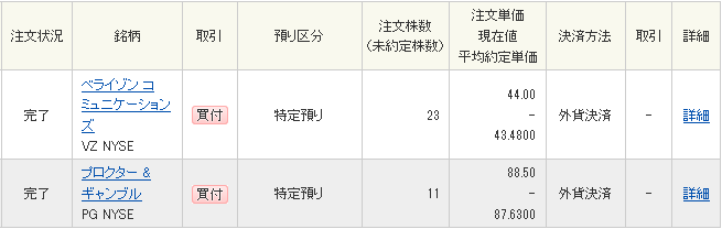 さて、今回購入した銘柄はベライゾン(VZ)とP&G(PG)です。手始めにそれぞれ1000ドルずつ購入しています。