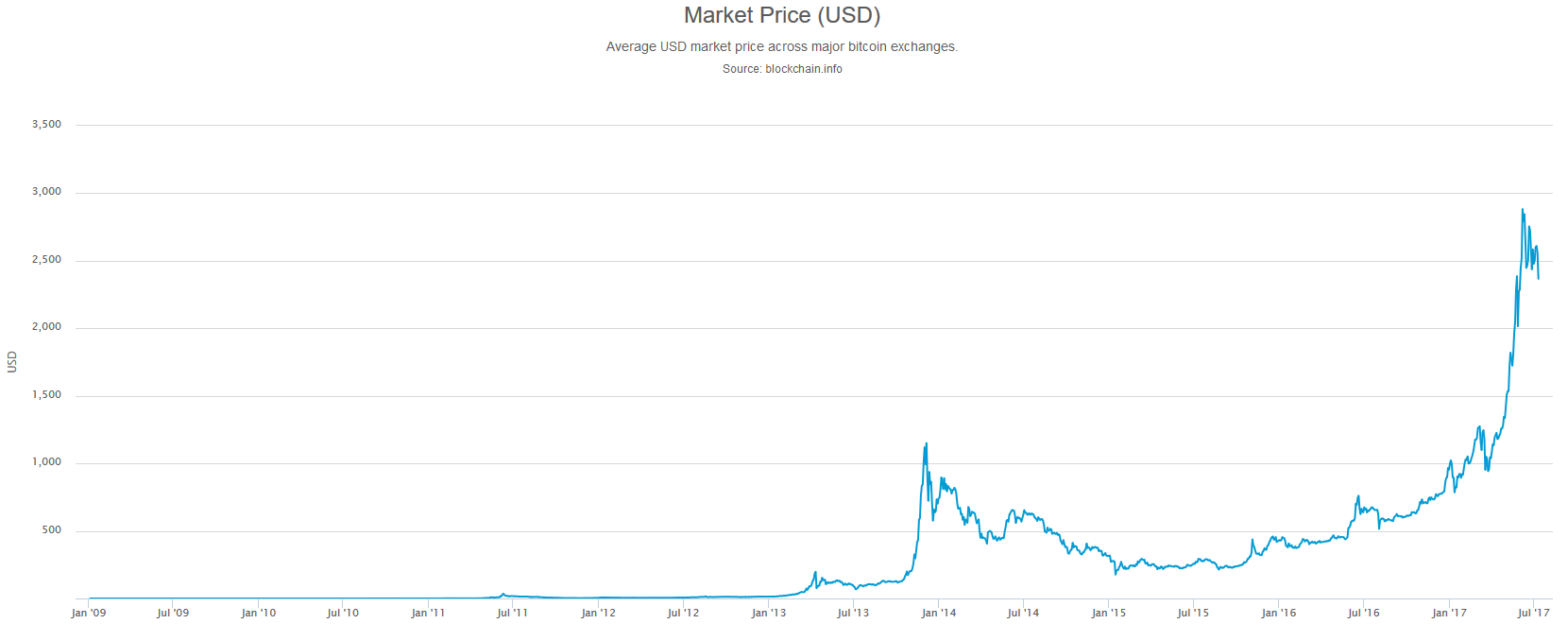 ビットコインを代表とする仮想通貨元年と呼ばれる2017年。仮想通貨の異常なまでの過熱ぶりで、当時は1BTC/1セント(1円)以下の価値しかなかったのですが、現在はなんと1BTC/2500-3000ドル(25-30万円)まで跳ね上がるという脅威の上昇を見せました。黎明期からビットコインを持っている人は、想像できない程の億万長者になっているということです。