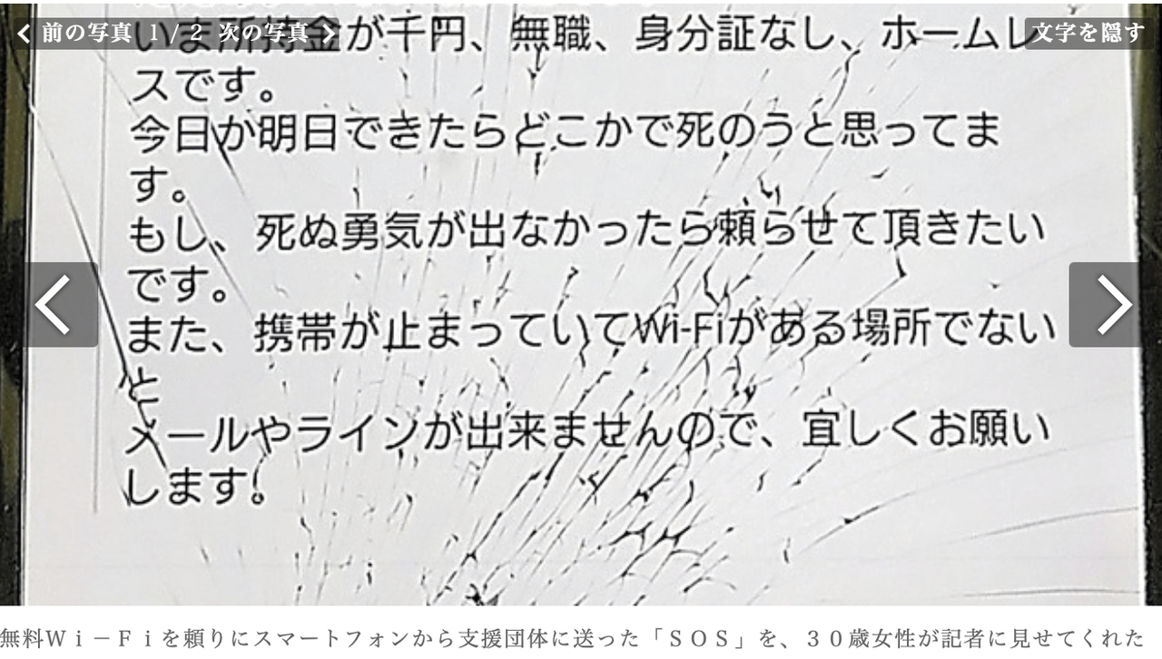 >いま所持金が千円、無職、身分証なし、ホームレスです
