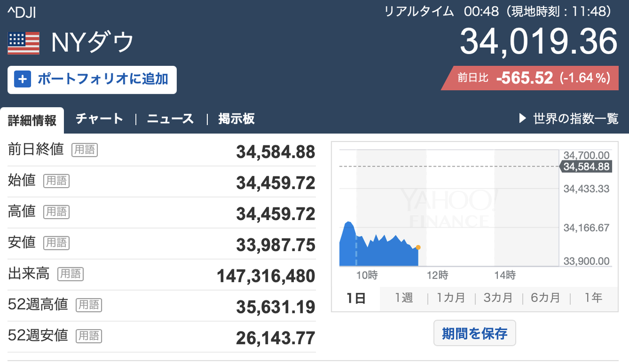 NYダウ平均株価 一時500ドル超下落 中国金融市場への警戒感
