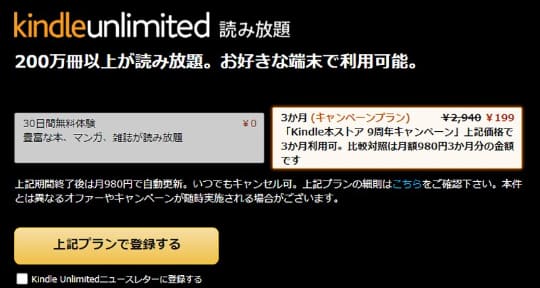 AmazonにてKindle Unlimitedが3か月199円(税込)で読み放題となるキャンペーンを開催しています。