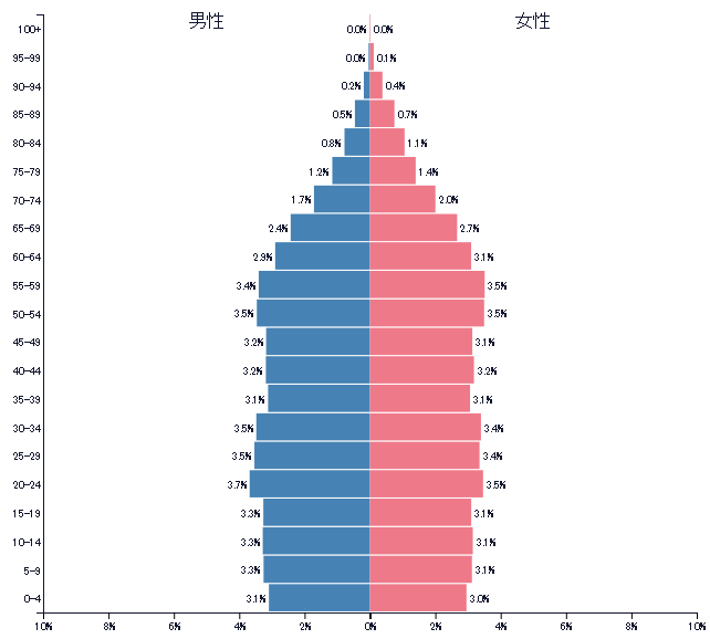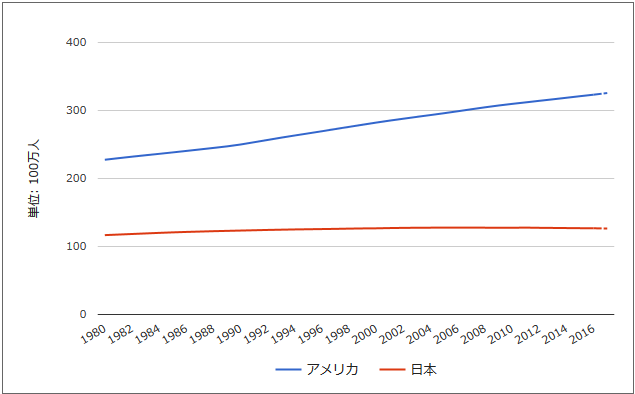 ご覧の通り、ベビーブーマーの50代世代より、これからの成長人口である20~30代のウエイトが大きいことがわかります。日本から見ると随分羨ましい話です。次に米国の人口推移です。