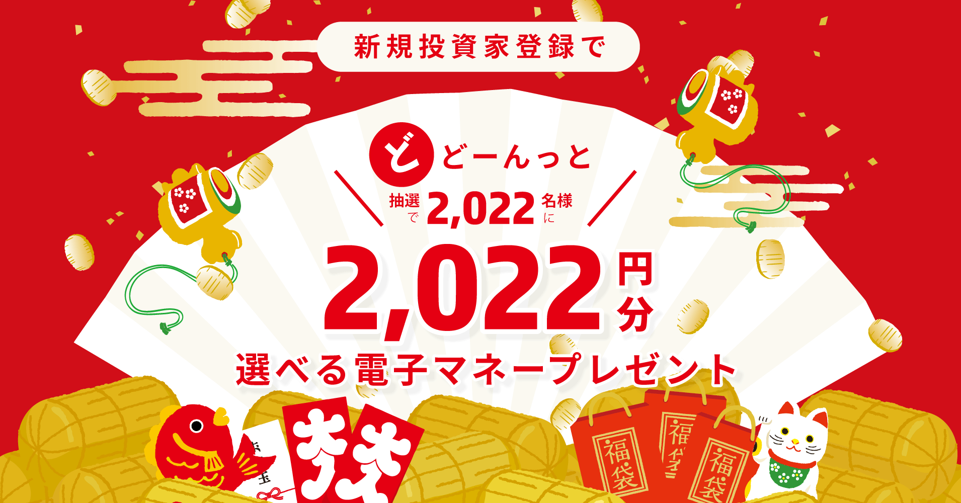 本キャペーンでは、「イークラウド」で新規投資家登録(無料登録)が完了したお客様の中から抽選で2,022名様に、複数の電子マネーや暗号資産の中から好きなギフトを選べる
