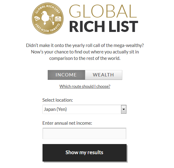 自分の年収が世界の上位何%で、どれぐらい恵まれているかを見せてくれる「Global Rich List」ってサイトご存知でしょうか?自分の年収を入力するだけで、自分が全体の上位何%で第何位ぐらいかを計算し、わかりやすく比較してくれるサイトです。