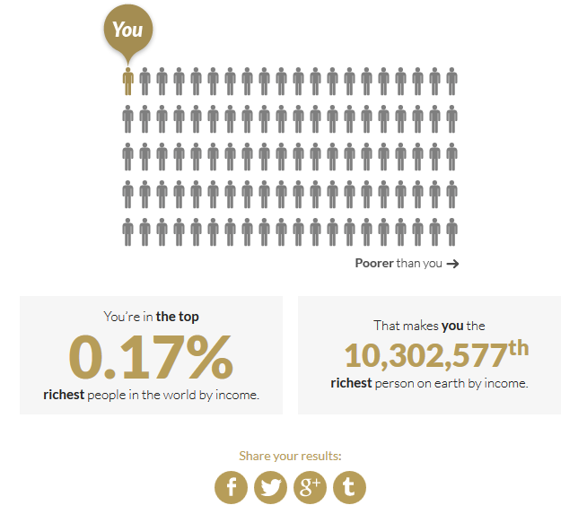 すると、このように結果が表示されます。見てください。私の年収は、全世界の上位0.17%に属しており、全人類のうち1千30万2577番目に裕福な人、と出ました。