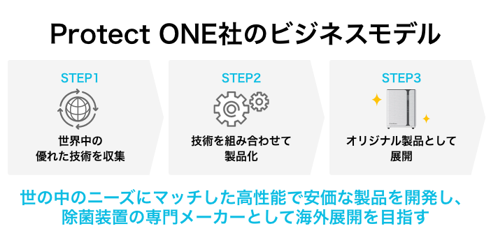株式会社Protect ONEは、「明るい未来の空気を作る」をコンセプトに2019年2月に設立されました。ファブレスメーカーとして世界の優れた技術や部品を組み合わせた高性能で安価なオリジナル製品『Air Future®』(商標登録第6488931号)を開発。除菌装置の製造分野で成長を目指しており、2026年1月期に売上高15億円、営業利益5億円を達成し、2027年にIPOを目指します。