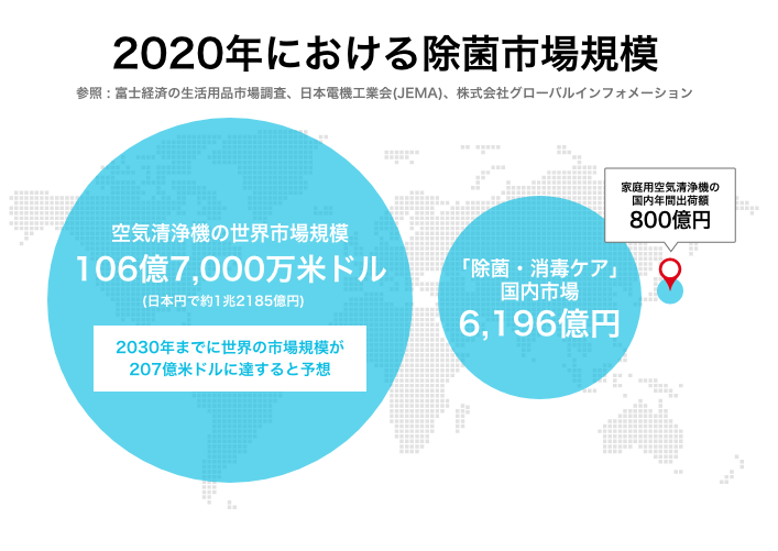 除菌市場は国内外問わず大きく伸びています。前述した通り、2020年の世界市場は前年比の約6倍まで膨れ上がりました。今後10年でその倍まで伸びると見られており2兆円を超える市場に成長する可能性があります。また、様々な場所での利用が見込めます。オフィスや家庭などはもちろん、遊園地などの施設や飛行機、電車、車とあらゆる場所に実装することができます。
