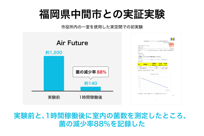 福岡県中間市の協力のもと、市役所の一室を借りて実証実験を行いました。室内で談笑後、菌の数値を計測。その場で『Air Future®』を1時間稼働させたところ、結果、室内空間の菌を88%減少させることに成功しました。