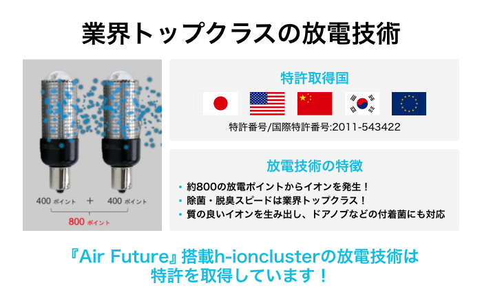 韓国のスド・プレミアム・エンジニアリング・カンパニー・リミテッドが生産する『h-ioncluster』(特許は日本等、5カ国において取得済)を、スド・プレミアム・エンジニアリング・カンパニー・リミテッドの日本法人である株式会社speより購入し『Air Future®』に搭載しています。また、「Air Future®」はブランド戦略として商標権を取得しています。