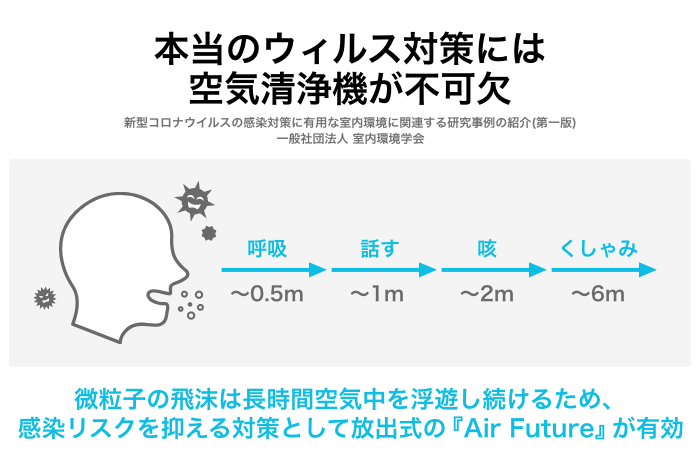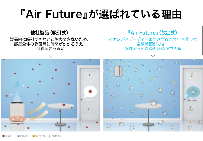 現在普及している多くの空気清浄機は吸引式のため、高い位置や遠くに浮遊したウイルスを吸引することができません。部屋の空気を循環させたり、機器を設置する場所を工夫したりと効果的に使うためのアイデアが必要です。『Air Future®』であれば放出式なので隅々まで空間除菌が可能です。