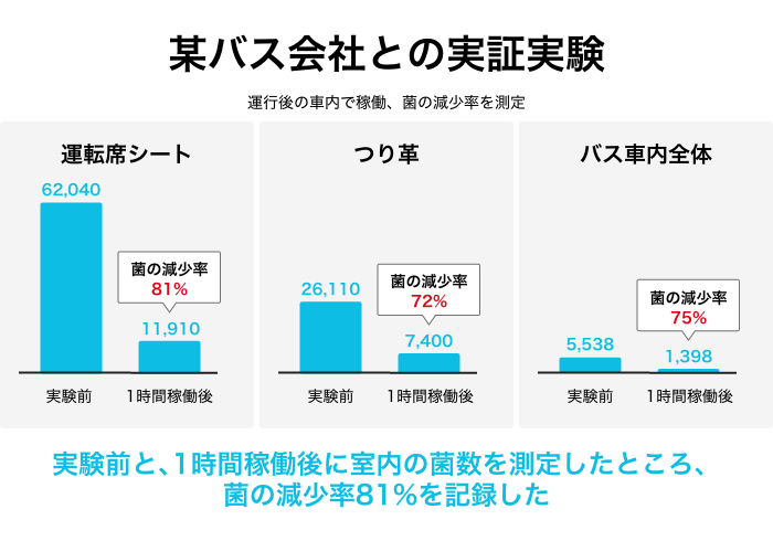 Protect ONEは某バス会社と連携し実証実験を行いました。ラッシュアワー後のバスを使用し、運転席のシート、つり革、車内空間の菌数が1時間でどれだけ除菌できるのかを検証。上図のように大きく効果があることがわかります。運転席など布に付着した菌に対しても除菌力を発揮しています。