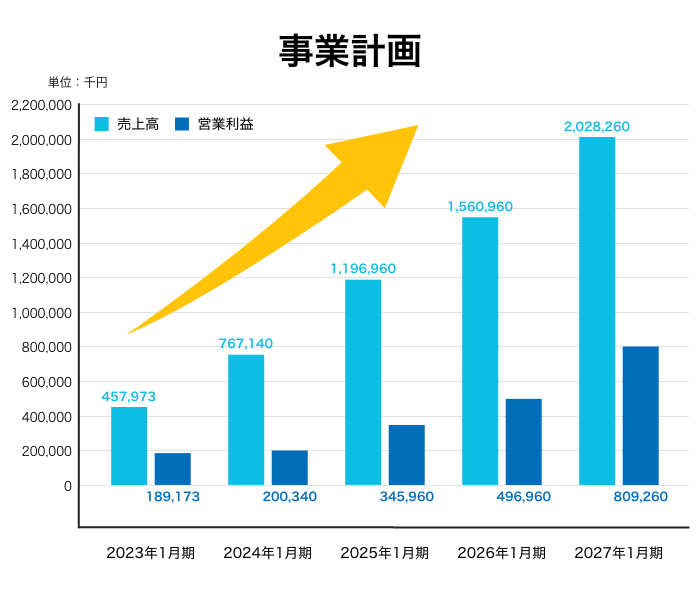 2026年1月期に売上高15億円、営業利益5億円を達成し、2027年にIPOを目指します。