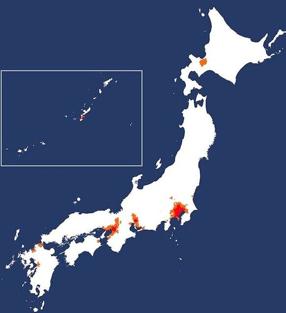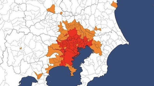 列島の中で赤く塗られているのは、首都圏、中京、関西など、ごく一部だ。後はほんの少しのオレンジ色があるものの、まったくの白地図同様である。なんともさっぱりしている。人口集中しているのは、面積的にはわずか、ということが一目瞭然だ。
