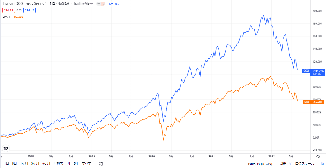 下のチャートは過去5年間のQQQ(青線)とS&P500指数(オレンジ線)の動きです。