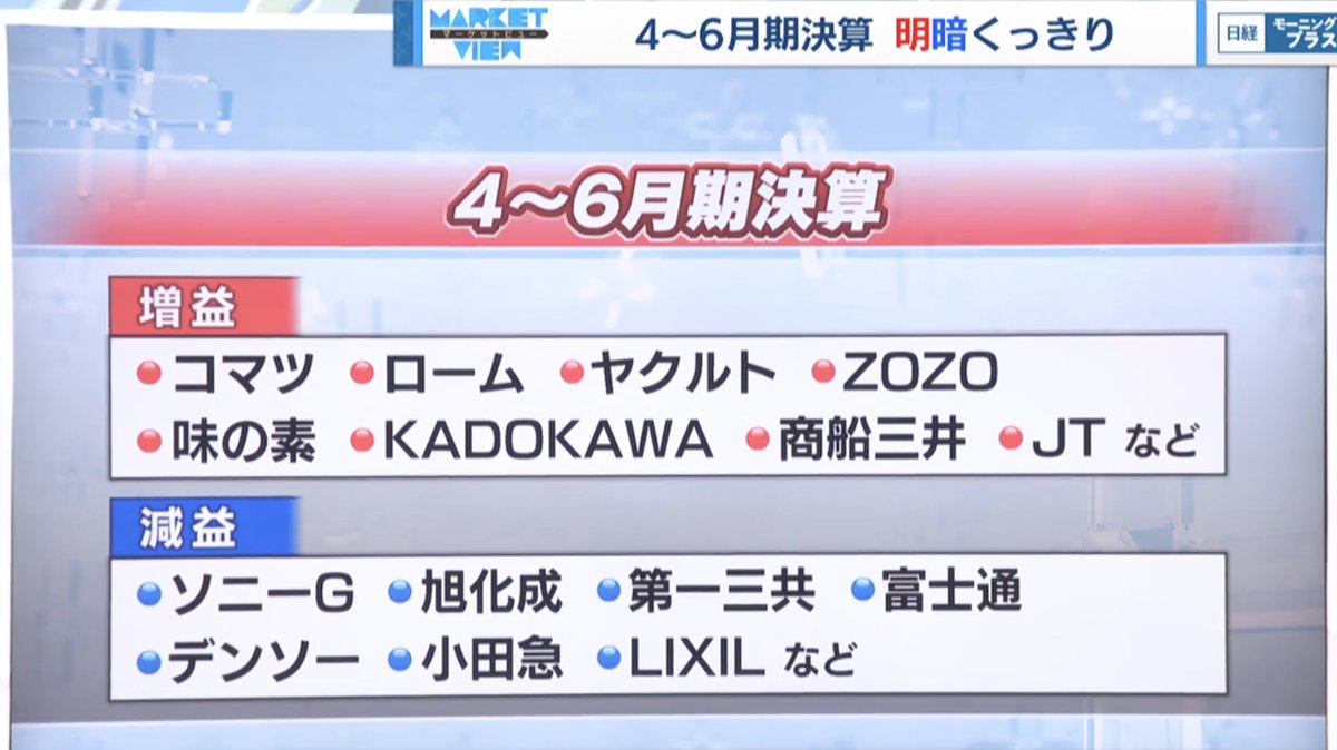 2022年08月01日 【画像】4月〜6月期の主要企業、明暗がはっきり分かれてると話題に 明暗くっきり pic.twitter.com/pOshiVqbxI — 平 均(@225average)Mon Aug 01 02:33:56 +0000 2022 みんなの反応がこちら! @225average どうだったら明暗くっきりじゃないのか— テキトー(@sokosokosokosan)Mon Aug 01 06:09:45 +0000 2022 タグ :#主要企業#画像 「ニュース・話題」カテゴリの最新記事 < 前の記事次の記事 > コメント コメントフォーム 名前 コメント 記事の評価 リセット リセット 顔 星 情報を記憶 コメントを投稿する