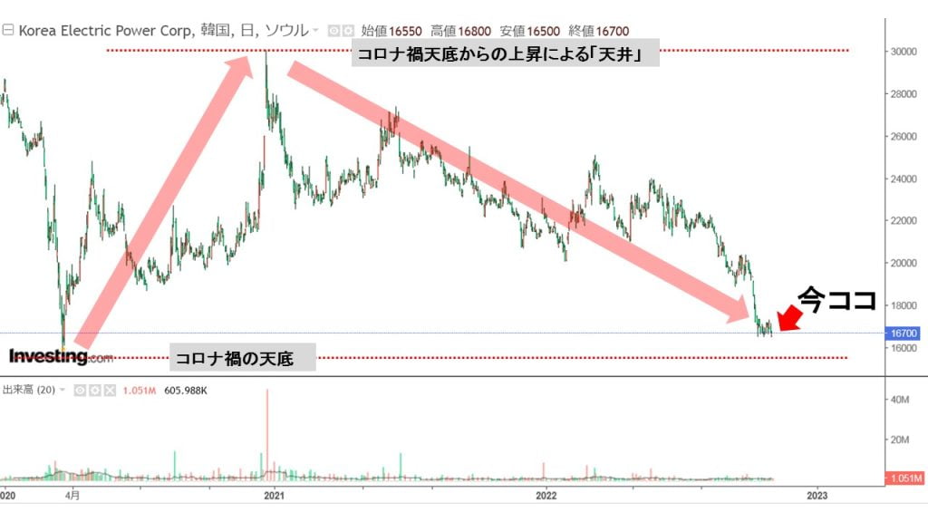 このような絶望的観測を受け、『韓国電力』の株価は大きく下げているのです。以下をご覧ください。