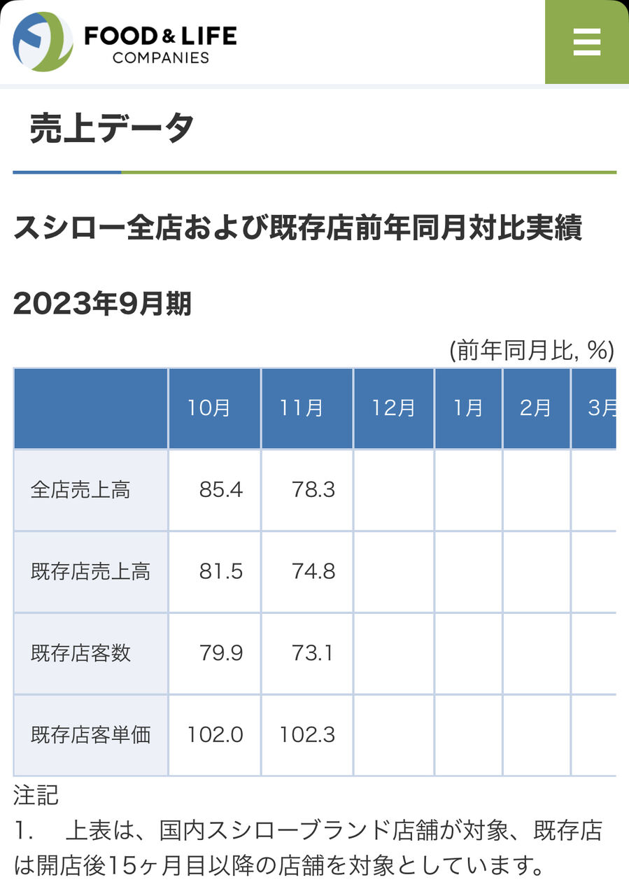 10月に値上げしたスシローは、度重なる不祥事もあろうが、やはり10月、11月ともに既存店客数が前年割れ。いずれも前年同月比で8割を切るなど、影響はくら寿司よりも深刻だ。