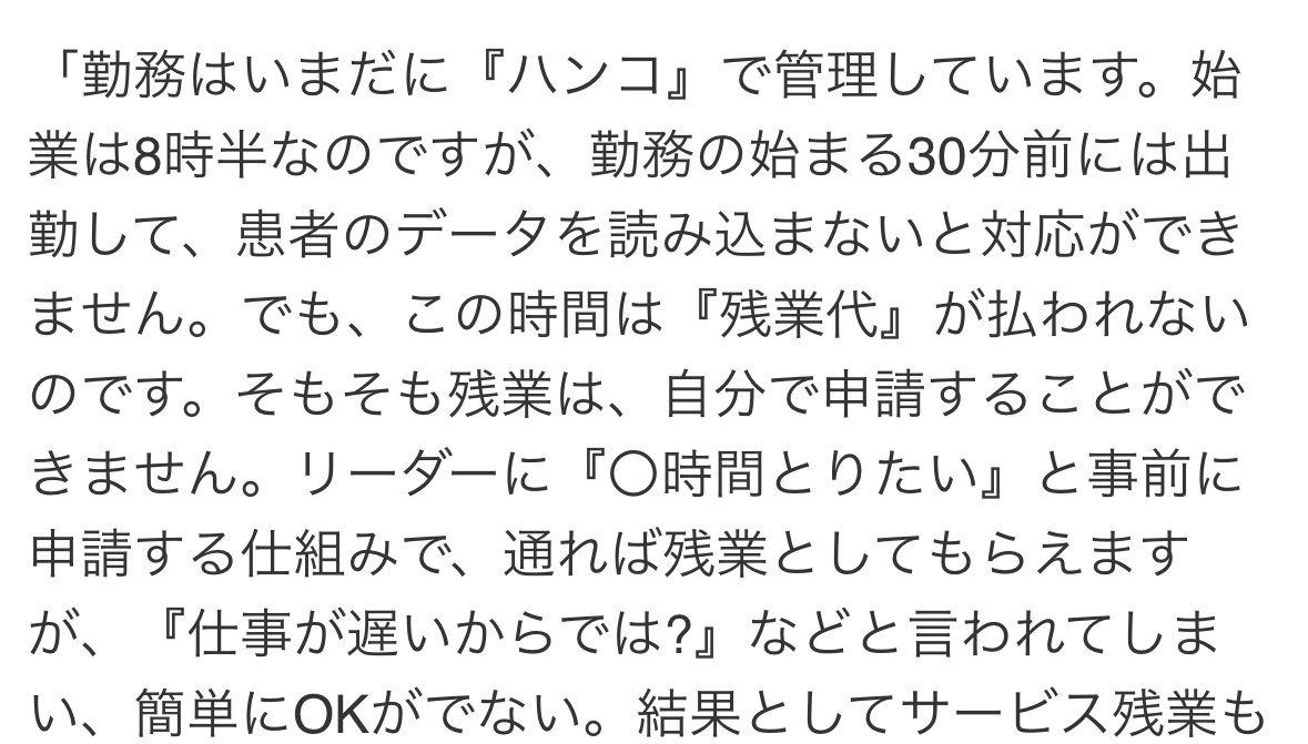 大量退職のニュース見て思ったけど、15分前出社して準備するのも残業なのか。知らぬ間に月5時間くらいサービス残業してるって事ね。