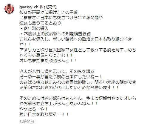 同氏は「老人が若者に道を示して、その席を譲るそーゆー事が当たり前の日本にしたいねー!」と続け、「のさばる権力欲まみれの老害は排除し、明るい未来の話ができる前向きな若者の時代にしたいと心から願います!! 」とコメントした。