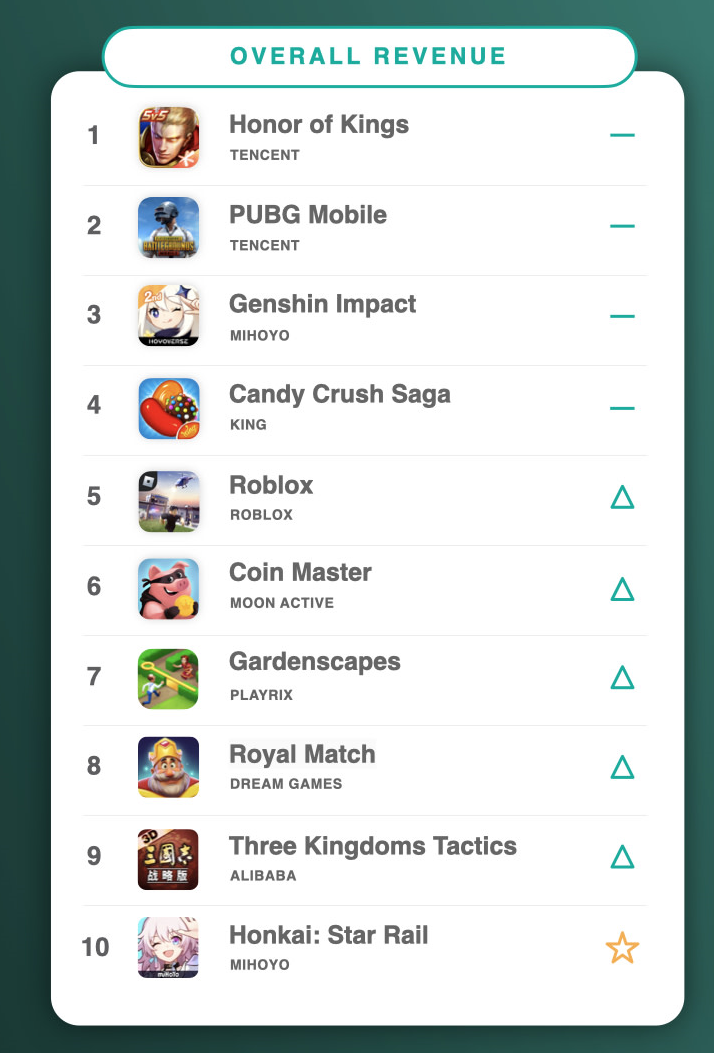 市場調査会社SensorTowerは2023年4月のモバイルゲームの全世界収益ランキングトップ10を公開した。