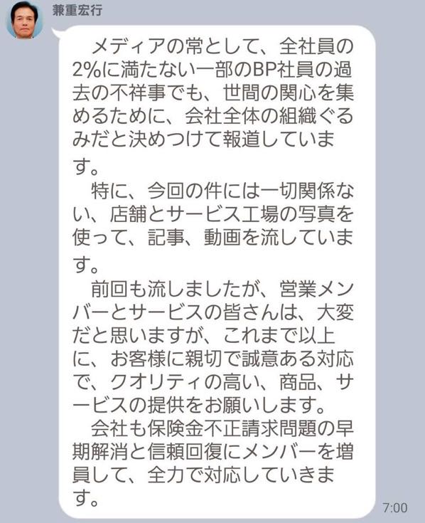 入手した文書によると兼重氏は「メディアの常として、全社員の2%に満たない一部のBP(板金塗装)社員の過去の不祥事でも、