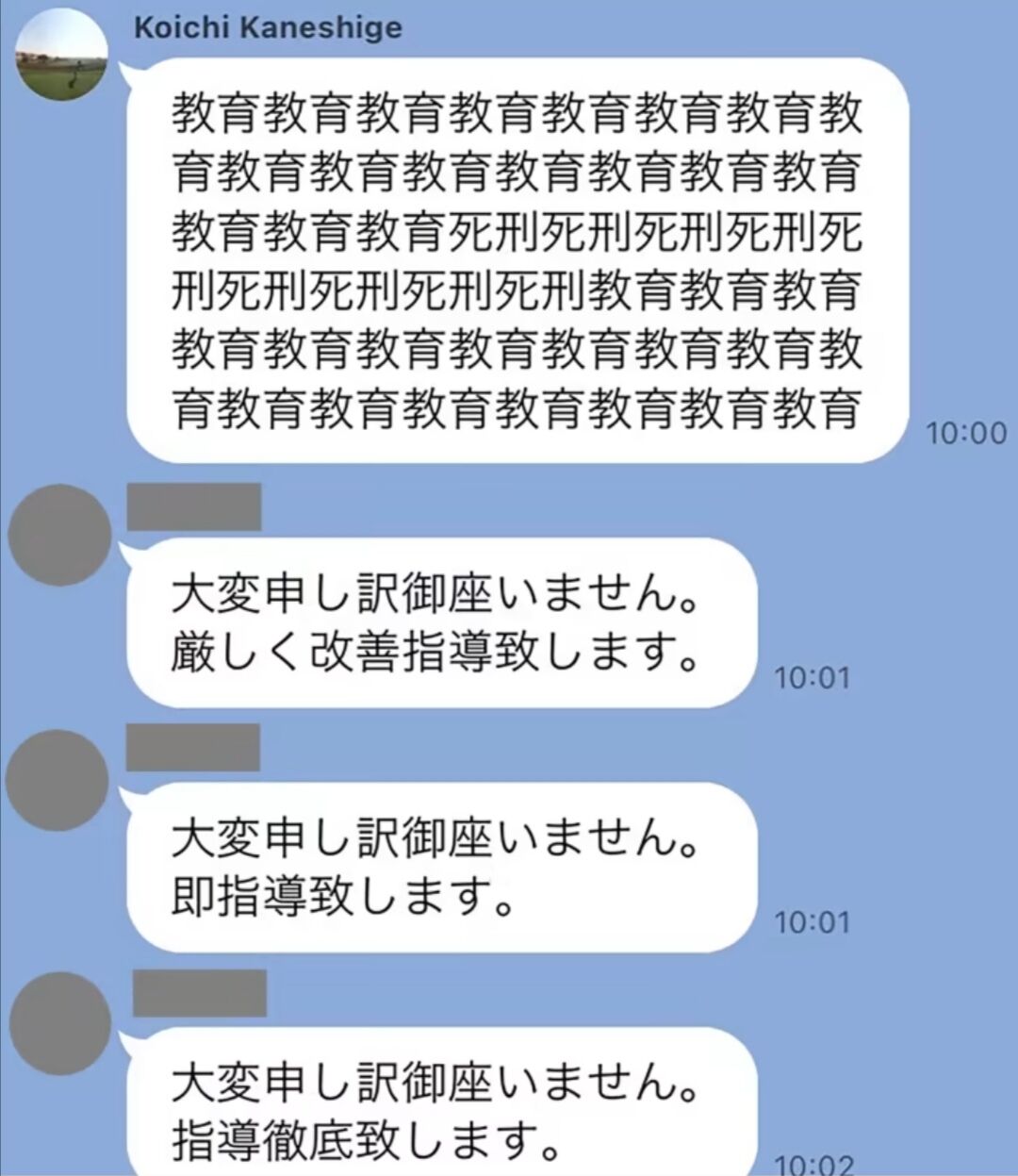 さらにハラスメント行為も常態化していたようだ。下のLINE画像を見てほしい。これは本誌が入手した、宏一氏と幹部たちのやりとりの一部とされるものである。宏一氏が「死刑」という言葉を使い、一方的に罵声を浴びせている。幹部たちは平謝りするしかない。