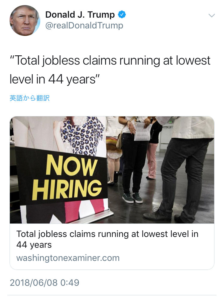 さて、そんな不安定な株式マーケットとは裏腹に、アメリカの経済は空前の好景気です。トランプ大統領のツイートでは、過去44年を遡って失業保険の申請数が最低の水準となったことを語っています。